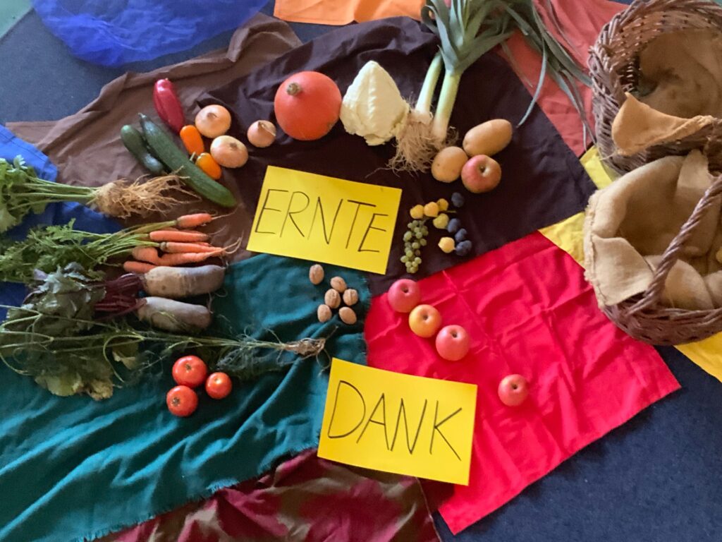 Anlässlich des Erntedankfests am ersten Sonntag im Oktober beschäftigten sich die Erstklässler des katholischen Religionsunterrichts mit dem Thema „Ernte“.
