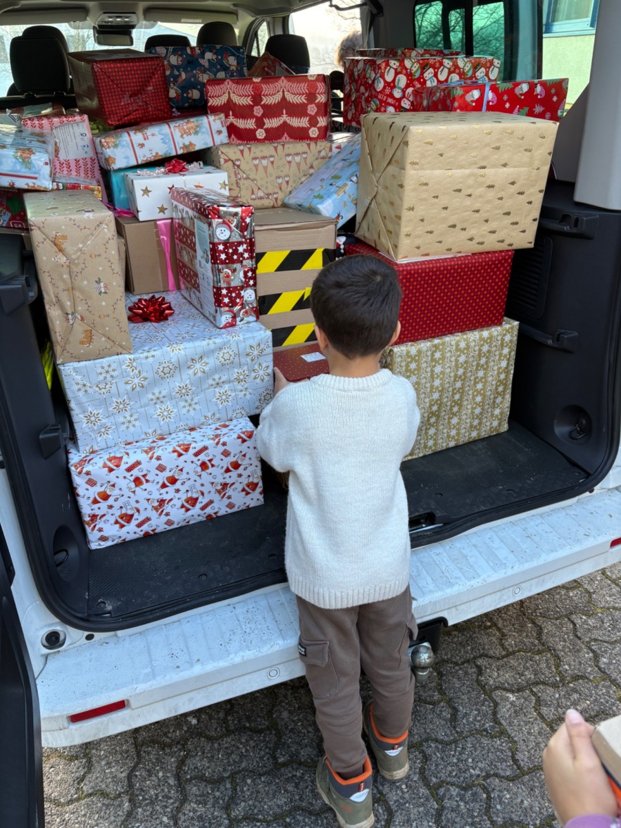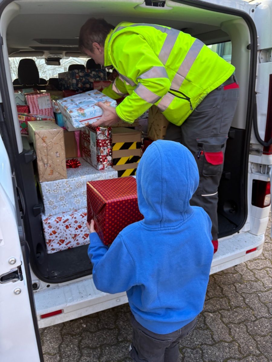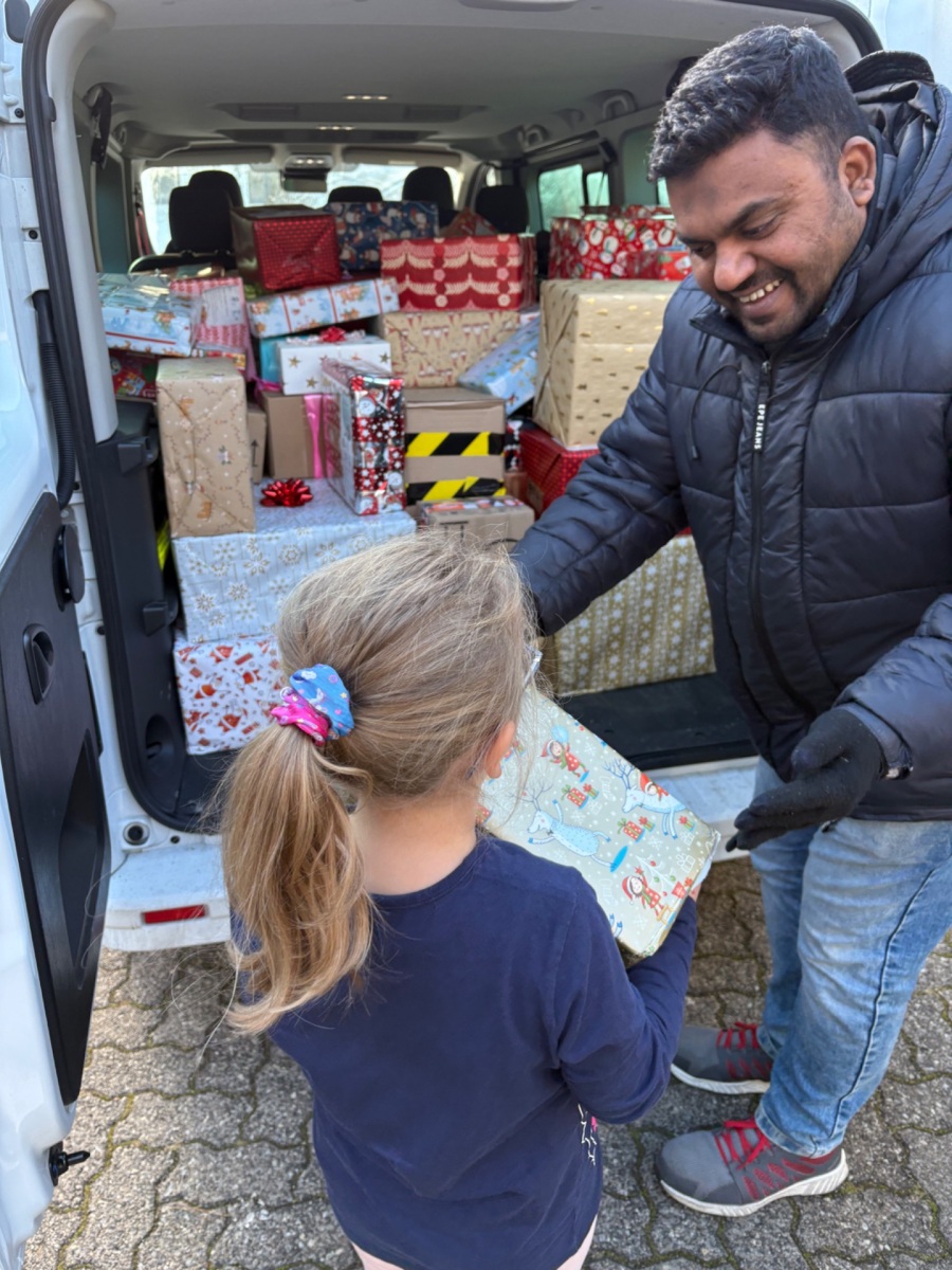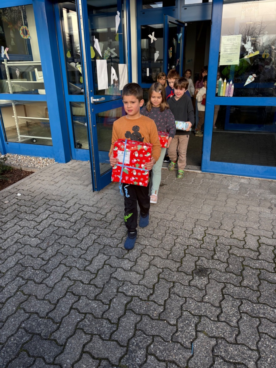Mitarbeiter vom Verein „Hinsehen und helfen“ holte sie ab. Manche unserer Schülerinnen und Schüler konnten die Pakete kaum tragen, waren sie doch reich gefüllt mit Lebensmitteln, Kleidung, Spielsachen und natürlich auch Süßigkeiten.